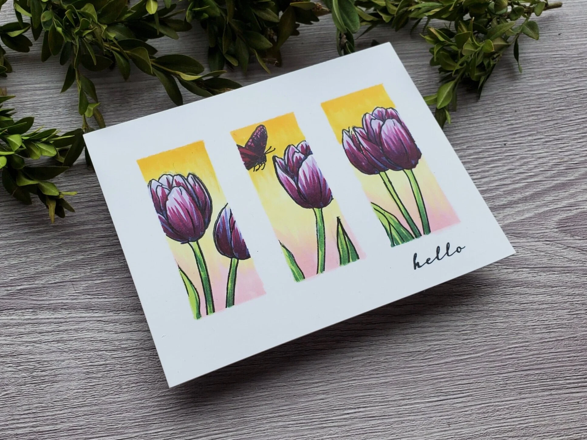 For my first card, I masked off three windows with some purple tape. Then, I fussy-cut some masks of the tulip and leaf images, running some removable adhesive over the back of each. Next, I stamped the tulips and leaves and butterfly images, masking each one behind the others.
