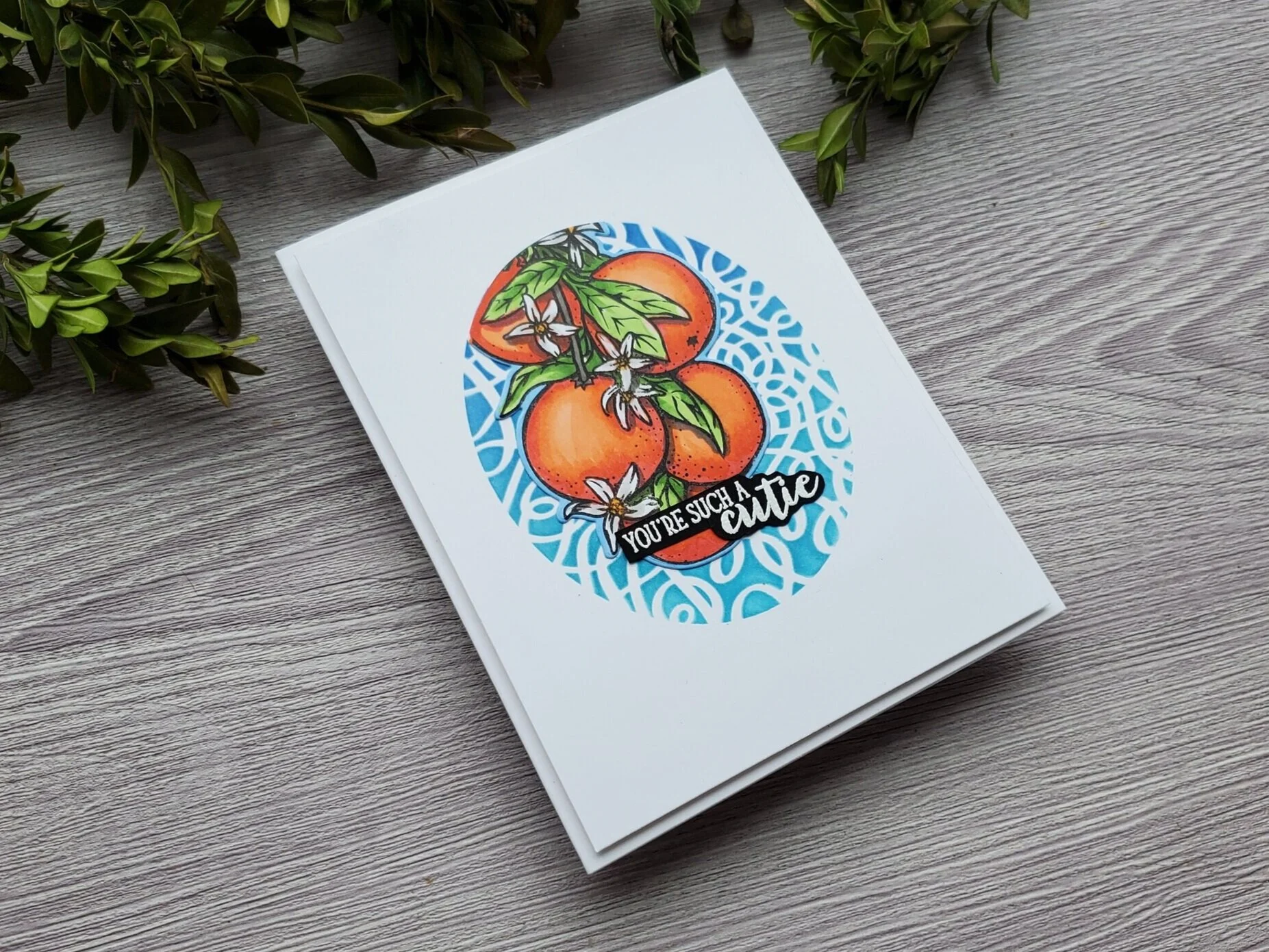 For my fifth card, I used the Orange Blossoms Combo stamps and dies in the same fashion as card #4. This time, though, I didn’t masked the oranges, I die cut them and glued them on to the front.