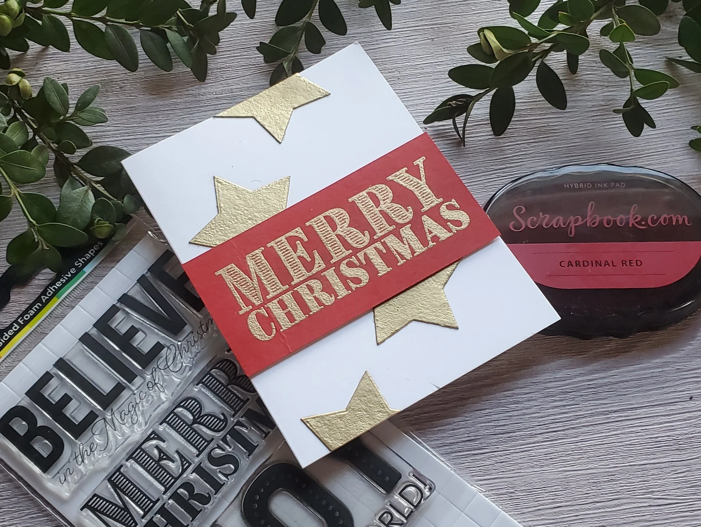For my third card, I die cut the small star twice and dipped them in embossing ink and heat embossed them in gold. I cut them in half and laid them out vertically. They appear to be four separate stars. Then, I embossed the big and bold sentiment: MERRY CHRISTMAS in gold embossing powder. I pressed the strip into the Cardinal Red Hybrid Ink and popped it up on the front of my card base with some double-sided foam rounds.