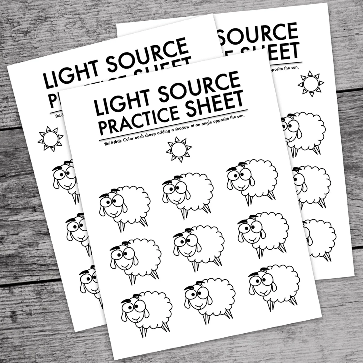 Practice makes perfect! These practice sheets will help you to put shadows in their place when you color. Just check the position of the sun on each sheet and add shading to the opposite side of the sheep.